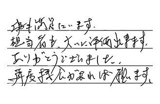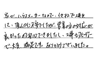 工事も満足しています。担当者も大いに評価出来ます。ありがとうございました。再度機会があれば、お願いします。