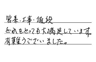 担当の方がきちんと対応してくれて、満足度は高かった。価格も他社に比べ安かった。