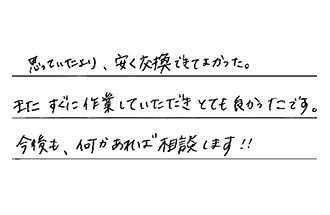 思っていたより、安く交換できてよかった。また、すぐに作業していただき、とても良かったです。今後も、何かあれば相談します!