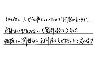 てきぱきと1人で仕事をしていたので、好感がもてました。余計なことも言わない(質問に対して)方で、価格に関係なく、大問屋さんでよかったと思います。