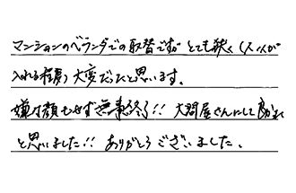 マンションのベランダでの取替ですが、とても狭く(人1人が入れる程度)大変だったと思います。嫌な顔もせず無事終了!大問屋さんにして良かったと思いました!ありがとうございました。