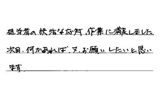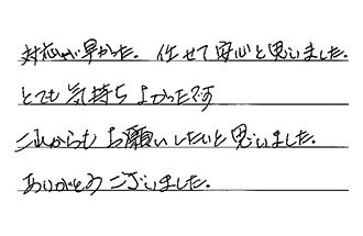 対応が早かった。任せて安心と思いました。とても気持ちよかったです。これからもお願いしたいと思いました。ありがとうございました。