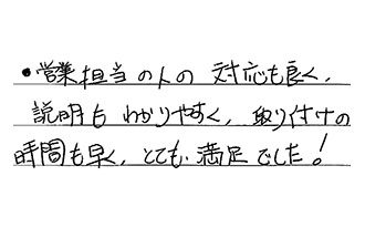 営業担当の人の対応も良く、説明もわかりやすく、取り付けの時間も早く、とても満足でした!