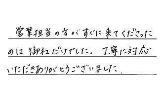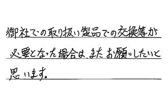 早く対応して頂き、ありがとうございました。大満足です。今後も宜しくお願いします。仕事もすばらしく、何もかも大満足です。