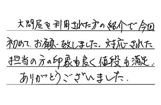 大問屋を利用された方の紹介で、今回初めてお願い致しました。対応された担当の方の印象も良く、値段も満足。ありがとうございました。