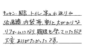 キッチン・風呂・トイレ等の水廻りや、給湯器・内装等、割と大がかりなリフォームになり期限も守っていただき、大変ありがたかったです。