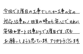 今回で3度目の工事でしたが、工事の方の対応・仕事が1回目の時から安心で、それに安価が第一と仕事ぶりで3度目です。次もお願いしようと思っています。アリガトウございます。