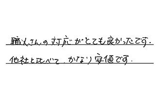 電話対応から施工まで、気持ちよく行って頂けました。安いのが1番ですが、スピードが早く、ていねいでした。ありがとうございました。