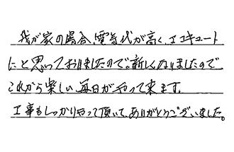 我が家の場合、電気代が高く、エコキュートにと思っておりましたので、新しくなりましたので、これから楽しい毎日がやって来ます。工事もしっかりやって頂いて、ありがとうございました。
