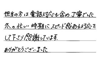 担当の方は、電話対応も含め丁寧でした。冬の忙しい時期に、スピード感ある対応をして下さり、感謝しています。ありがとうございました。