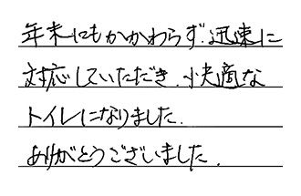 年末にもかかわらず、迅速に対応していただき、快適なトイレになりました。ありがとうございました。