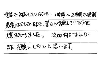 電話で対応していただき、1時間~2時間で現調・見積りまでしていただき、翌日に交換していただき、大変助かりました。次回何かあれば、またお願いしたいと思います。
