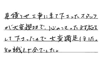 見積りや工事に来て下さったスタッフが大変親切で、心のこもった対応をして下さったので、大変満足しました。知識も十分でした。