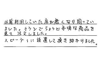 以前利用していた店が無くなり、困っていました。チラシでちょうど手頃な商品を見て、注文しました。スピーディに設置して頂き、助かりました。