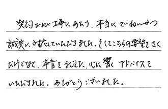 契約および工事にあたり、本当にていねいかつ誠実に対応していただきました。そしてこちらの要望をきくだけでなく、本音をまじえた心に響くアドバイスをいただきました。ありがとうございました。