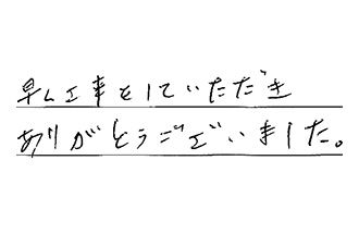 連絡してから30分後に家まで見積りをしに来てくれました。また、見積り時と工事時に同じ方が対応して下さったので、とても安心感がありました。ありがとうございました。