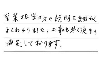 営業担当の方の説明も細かく、よくわかりました。工事も早く決まり、満足しております。