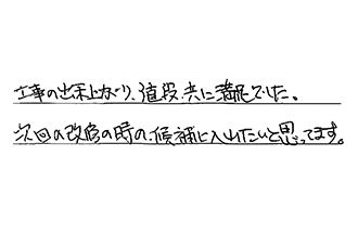施工のスピード、営業の対応、共に大変良かった。金額も3社見積りを取った中で、一番安かったです。