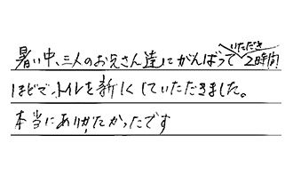 暑い中、とても綺麗にトイレを設置していただき、ありがとうございました。また何か買い換えの時には、お願いしようかと思ってます。