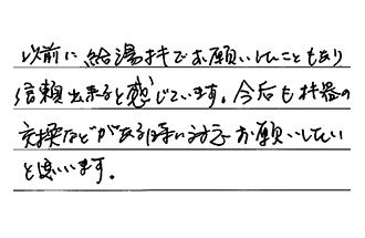 以前に給湯器でお願いしたこともあり、信頼出来ると感じています。今後も機器の交換などがある時は、対応お願いしたいと思います。