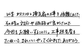 以前、ガスコンロと換気扇の工事を依頼しました。その時の対応や価格が良かったので、今回もお願いすることに。工事担当者もていねいで、きれいにやってくれました。ありがとう。