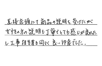 直接、店頭にて、商品の説明を受けたが、女性の方の説明も丁寧で、とても感じが良かったし、工事担当者も、同じく良い印象でした。