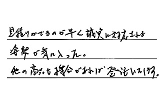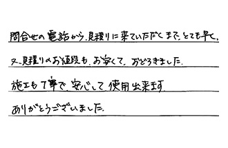 問合せの電話から、見積りに来ていただくまで、とても早く、又、見積りのお値段も、お安くて、おどろきました。施工も丁寧で、安心して使用出来ます。ありがとうございました。
