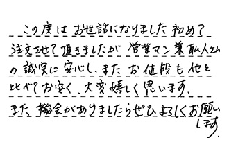 この度はお世話になりました。初めて注文させて頂きましたが、営業マン兼職人さんの誠実に安心し、また、お値段も他と比べてお安く、大変嬉しく思います。また、機会がありましたらぜひよろしくお願いします。