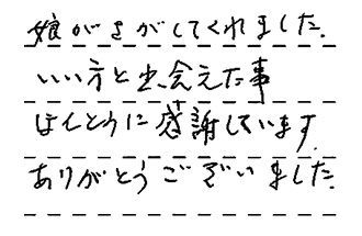 娘がさがしてくれました。いい方と出会えた事、ほんとう感謝しています。ありがとうございました。