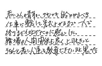若い2人の青年がテキパキ自分のやるべき仕事に専念して、完成させるまで一人で終りまで仕上げたのに感心した。職場の人間関係も良く、上司もきっときちんと若い人達を教育できていると思った。