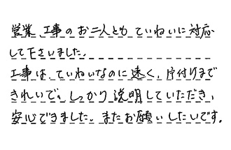 営業、工事のお二人とも、ていねいに対応して下さいました。工事は、ていねいなのに速く、片付けまできれいで、しっかり説明していただき、安心できました。またお願いしたいです。