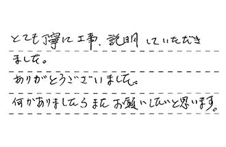 とても丁寧に工事、説明していただきました。ありがとうございました。何かありましたら、またお願いしたと思います。