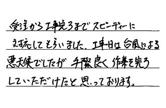 受注から工事完了まで、スピーディーに対応してもらいました。工事日は台風による悪天候でしたが、手際良く作業を完了していただけたと思っております。