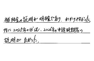 補助金の説明が明確であり、わかりやすかった。特に2025年の状況、2026年の申請時期等の説明が良かった。
