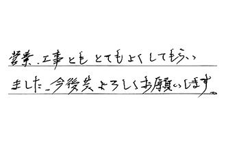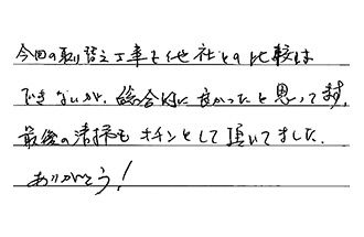 今回の取り替え工事を他社との比較はできないが、総合的に良かったと思ってます。最後の清掃もキチンとして頂いてました。ありがとう!