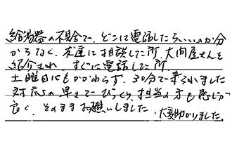 給湯器の不具合で、どこに電話したらいいか分からなく、友達に相談した所、大問屋さんを紹介され、すぐに電話した所、土曜日にもかかわらず、30分で来られました。対応の早さでびっくり、担当の方も感じが良く、そのままお願いしました。大変助かりました。