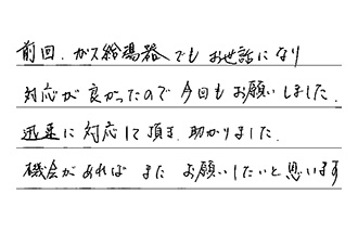 契約しているガス屋さんが「大問屋さんなら安心ですよ」と教えていただきました。ガス屋さんの方から教えてくださる事にも驚きました。みなさんもとても対応もよく、工事してくださる方も大変親切・丁寧に対応してくださり、とても安心しておまかせする事が出来ました。これからも何かあれば、大問屋さんを頼りにしていこうと思っております。ありがとうございました。