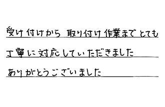 受け付けから取り付け作業まで、とても丁寧に対応していただきました。ありがとうございました。