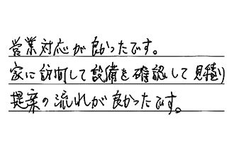 営業対応が良かったです。家に訪問して設備を確認して見積り提案の流れが良かったです。