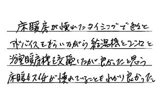 本当に助かりました。故障でしたので、営業の方も見積り、工事の日など、とても早く対応して下さり、感謝の気持ちでいっぱいです。ありがとうございました。