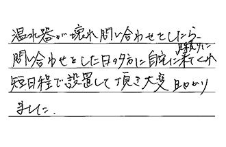 早急に対応していただいて、大変たすかりました。工事時間も早かったです。ありがとうございました。