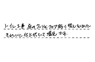 営業の方の誠実な対応で、ウォシュレット交換決めました。工事も丁寧にきれいな仕上がりで、満足しております。