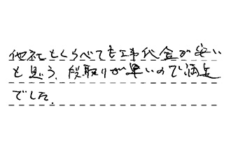 対応がじんそくで、見積もりも、思っていたより安価であった。営業担当者も誠意があり、感じが良くて、色々と話しやすくて、こちらの希望にも気軽く対応して頂いた。