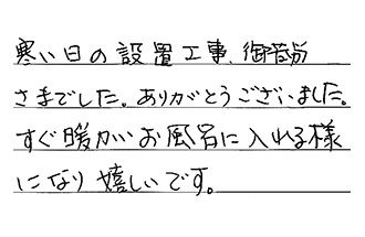 寒い日の設置工事、御苦労さまでした。ありがとうございました。すぐ温かいお風呂に入れる様になり、嬉しいです。