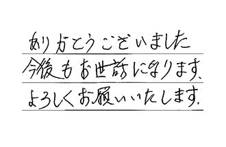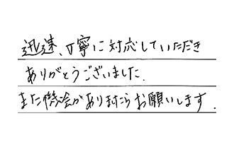 迅速、丁寧に対応していただき、ありがとうございました。また機会がありましたら、お願いします。