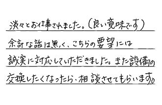 淡々とお仕事されました。(良い意味です)余計な話は無く、こちらの要望には誠実に対応していただきました。また設備の交換したくなったら、相談させてもらいます。