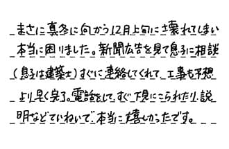 まさに真冬に向かう12月上旬に壊れてしまい本当に困りました。新聞広告を見て息子に相談(息子は建築士)すぐに連絡してくれて、工事も予想より早く完了。電話をしてすぐ下見にこられたり、説明など丁寧で、本当に嬉しかったです。