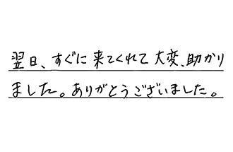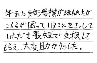 年末に給湯器が壊れたが、こちらが困っていることをさっしていただき、最短で交換してもらえ、大変助かりました。