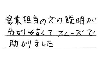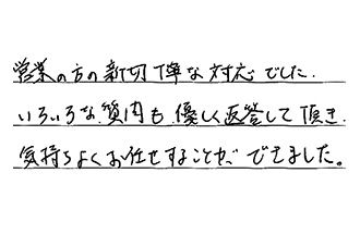 営業の方の親切・丁寧な対応でした。いろいろな質問も優しく返答して頂き、気持ちよくお任せすることができました。