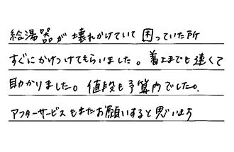 給湯器が壊れかけていて、困っていた所、すぐにかけつけてもらいました。着工までも速くて、助かりました。値段も予算内でした。アフターサービスもまたお願いすると思います。